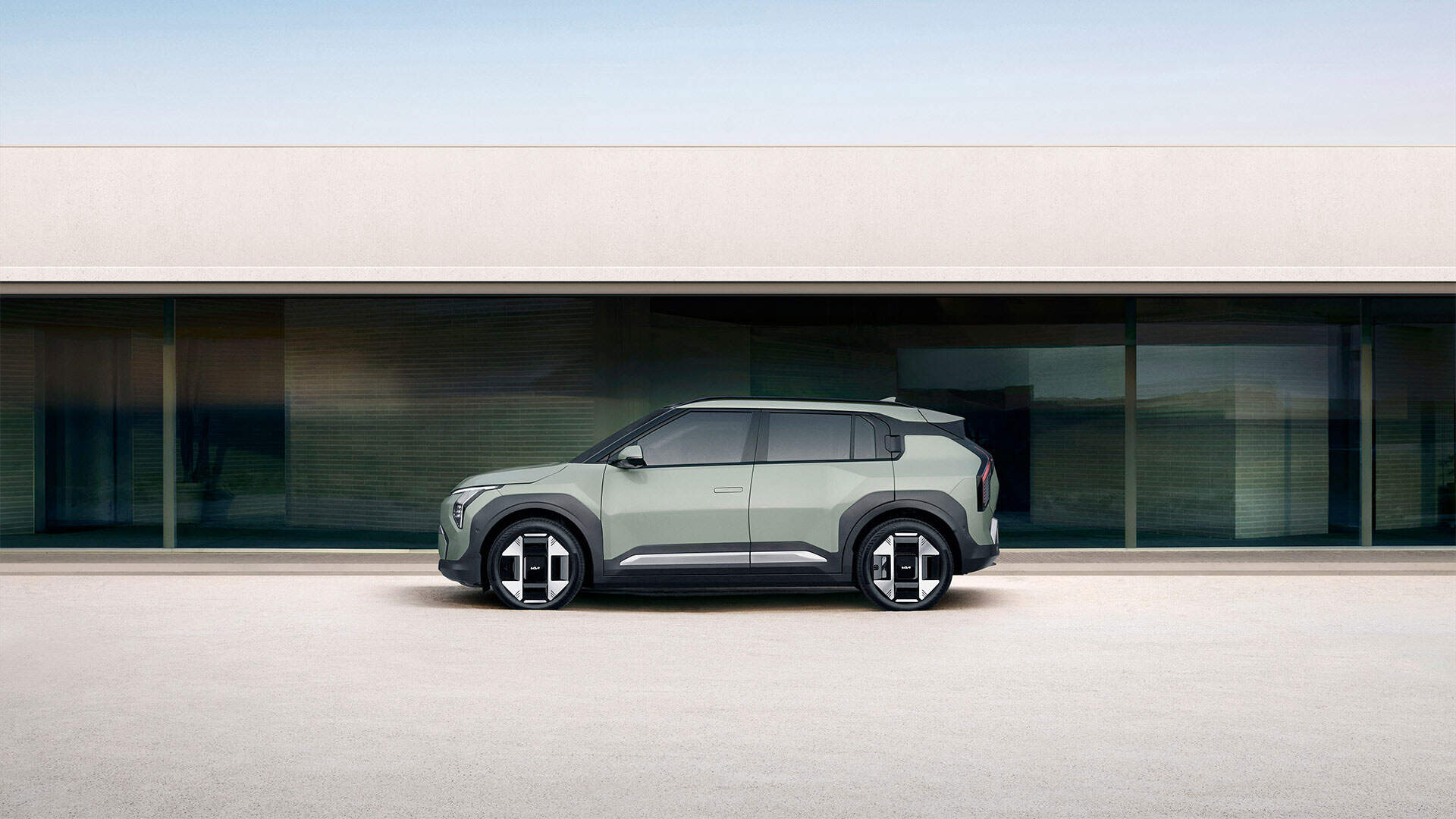 The Kia EV3 retains much of the design language from the concept model, resembling a scaled-down version of the larger Kia EV9. The SUV features an upright front with sleek daytime running lights that integrate seamlessly with the trim across the bonnet, creating a clean, modern look. The side profile includes chunky black cladding and flush-fitting door handles, adding to its muscular appearance. Customers can choose from nine color options, including a new light green hue.